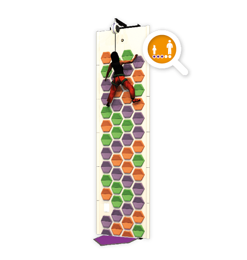 Unique hexagonal-shaped holds create a stimulating honeycomb challenge. Big moves required depending on the color of the route. Purple look easy and green look perfect!